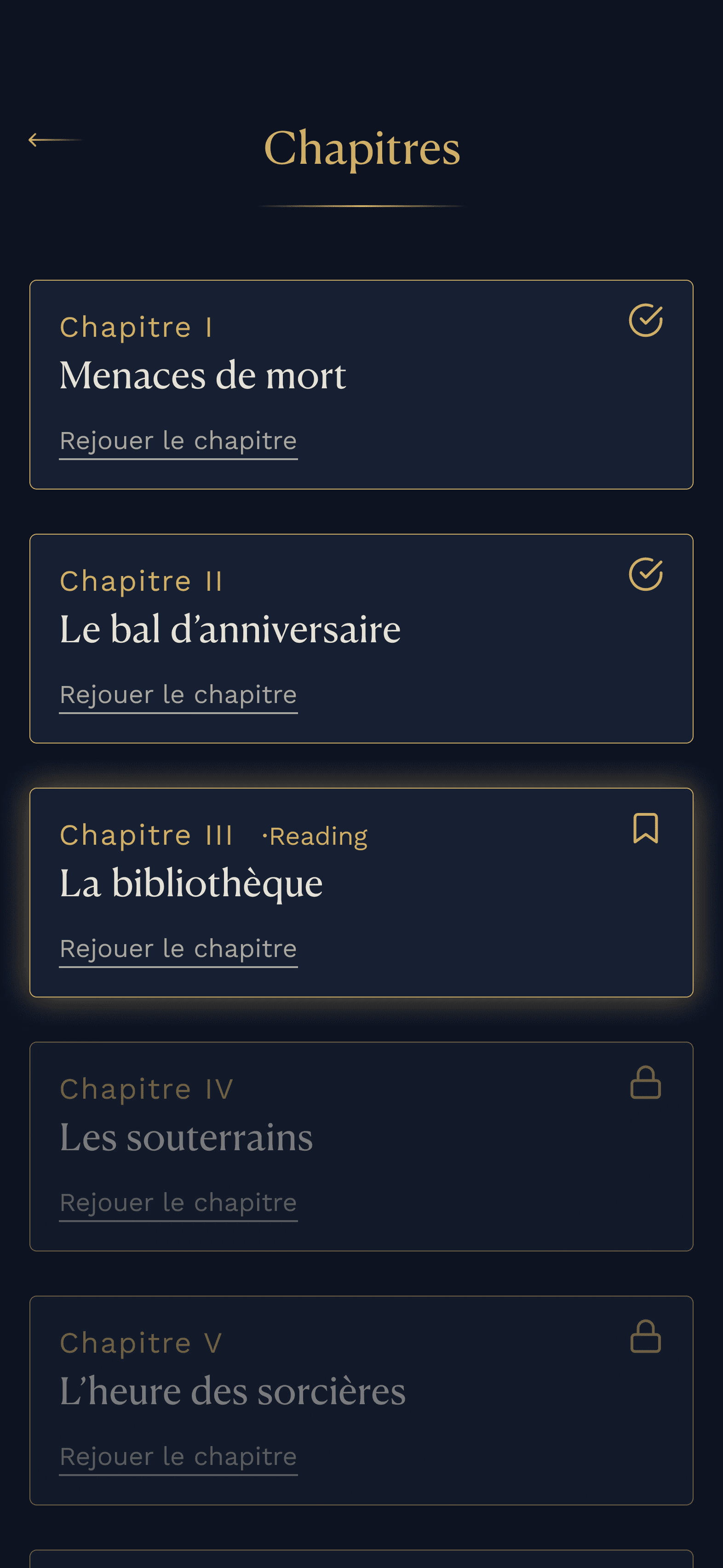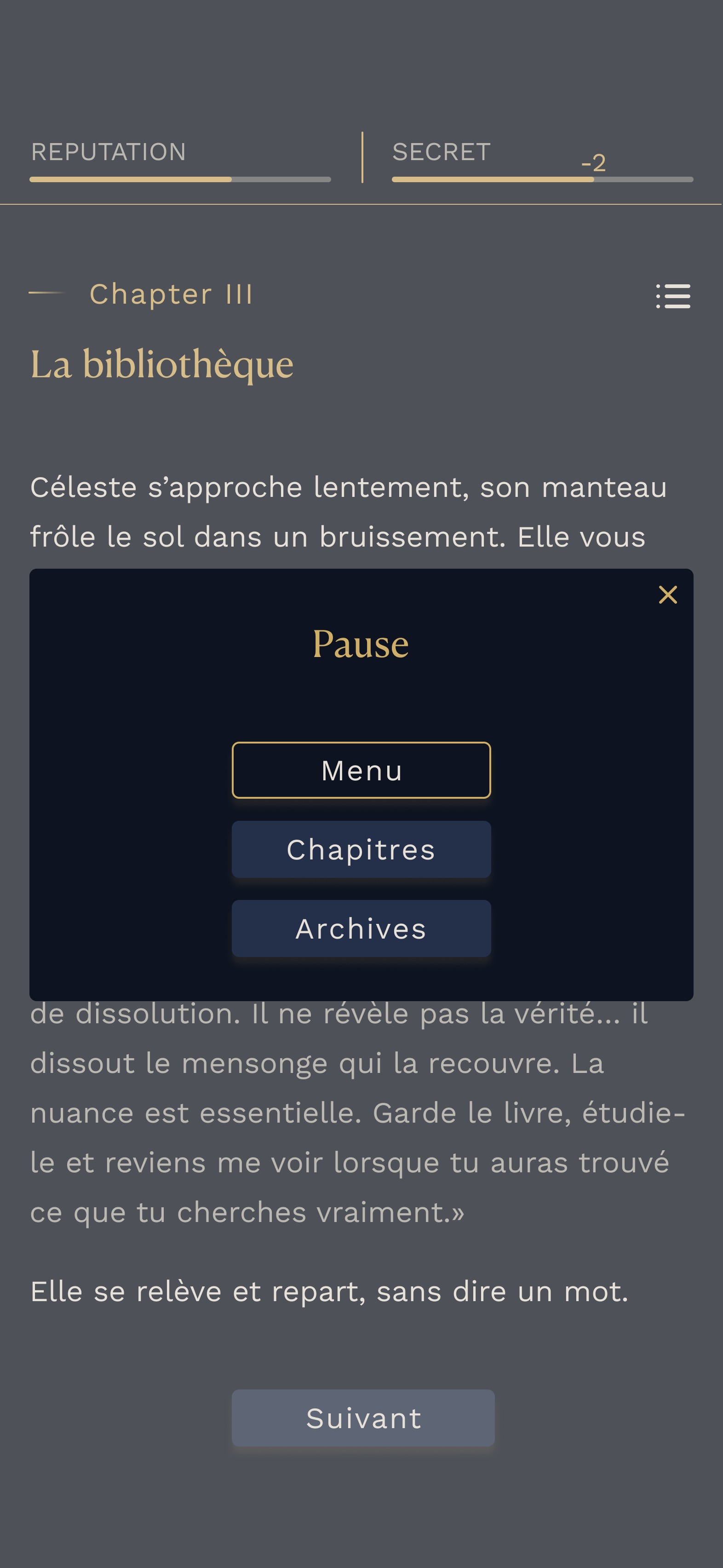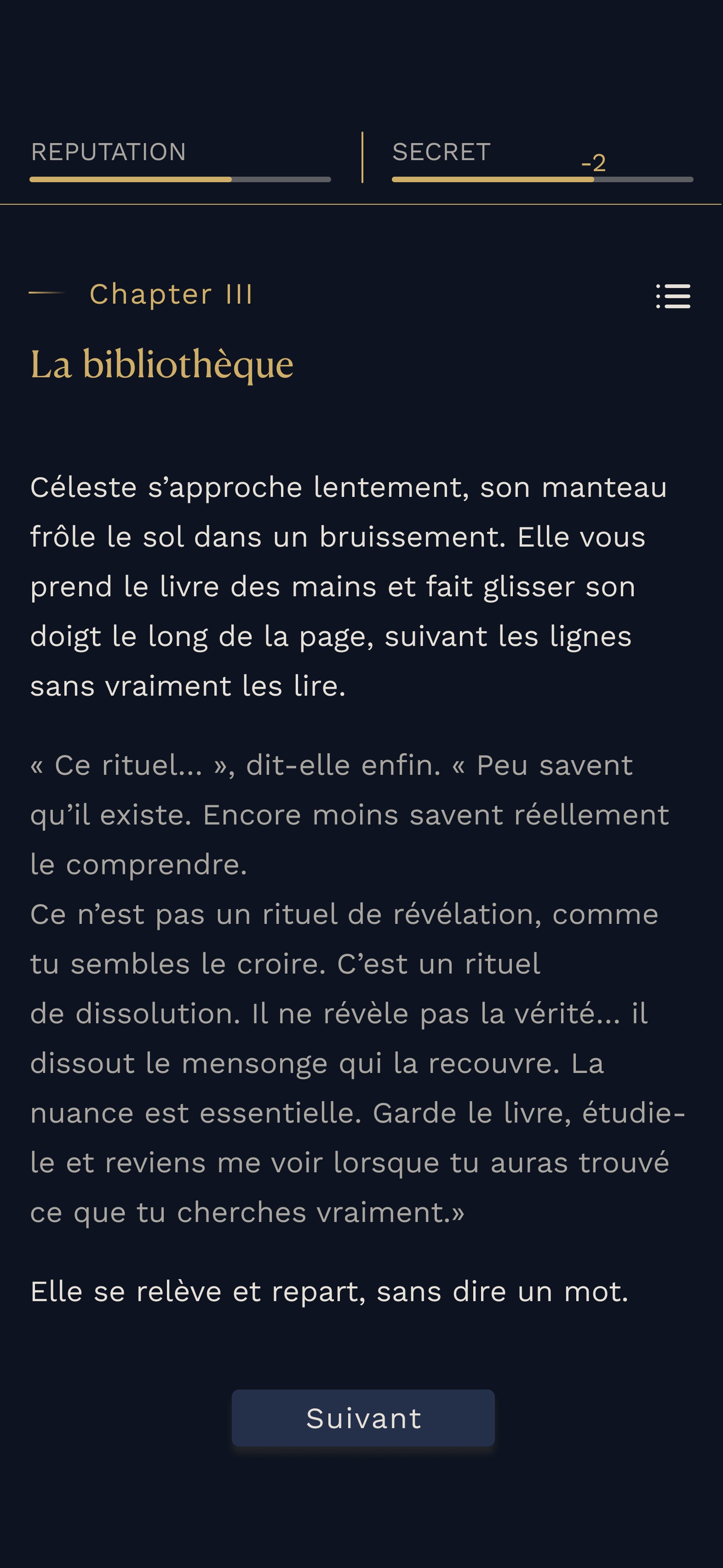 Comment offrir une expérience de lecture interactive qui conjugue immersion, liberté et accessibilité, sans compromettre la richesse narrative d’un univers d’auteur ? Ravennes répond à ce besoin en repensant le jeu narratif mobile comme une porte d’entrée vers un monde littéraire : une interface épurée centrée sur la lecture, des choix narratifs libres de toute contrainte économique et une direction artistique qui valorise la profondeur et la cohérence du récit.