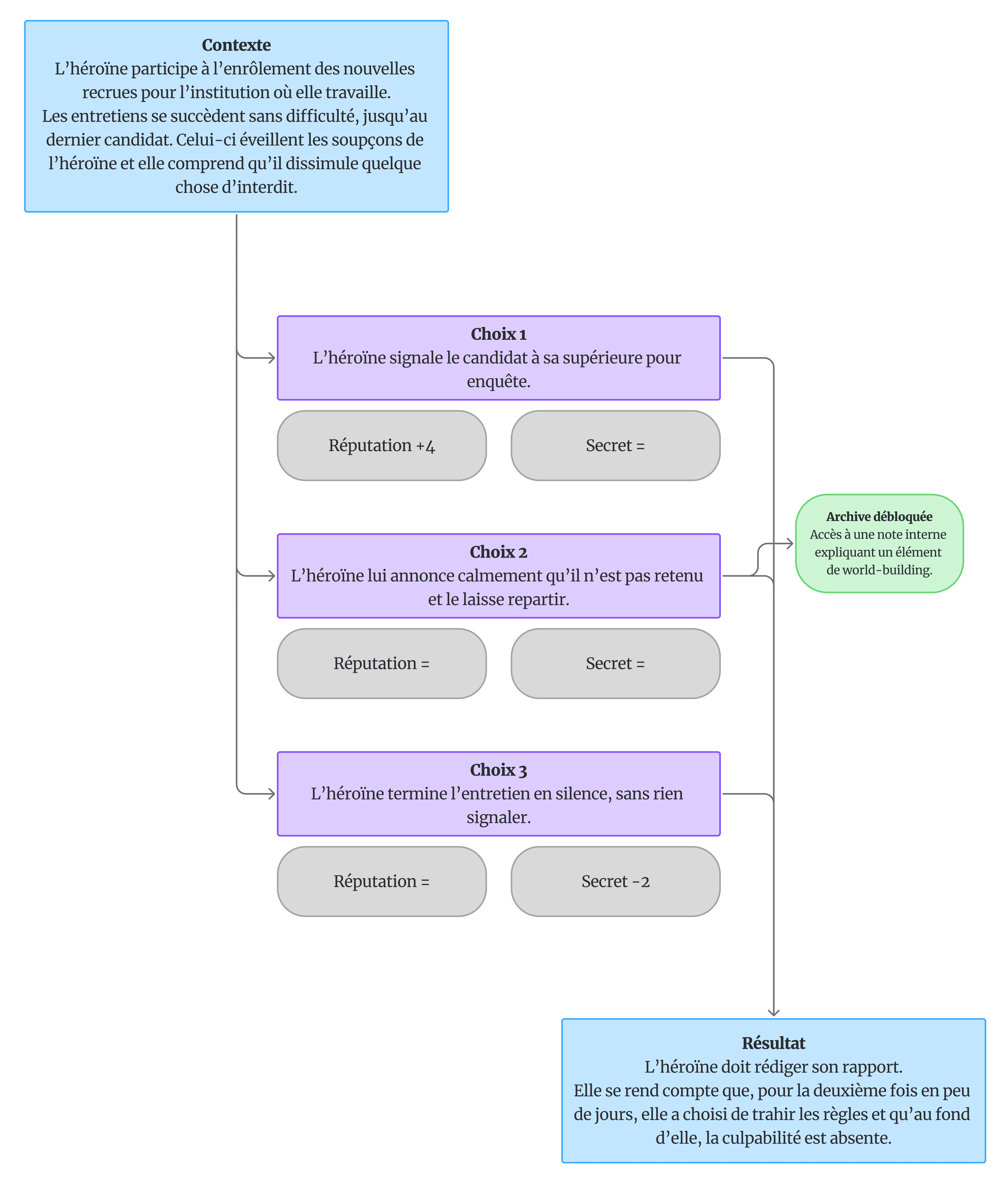 Ces variables modifient la réaction des interlocuteurs, la suite des dialogues et permettent parfois de débloquer des scènes exclusives (détails du world building). L’arbre ne représente pas l’ensemble de l’histoire, mais met en évidence la logique décisionnelle et les conséquences locales d’un passage clé.