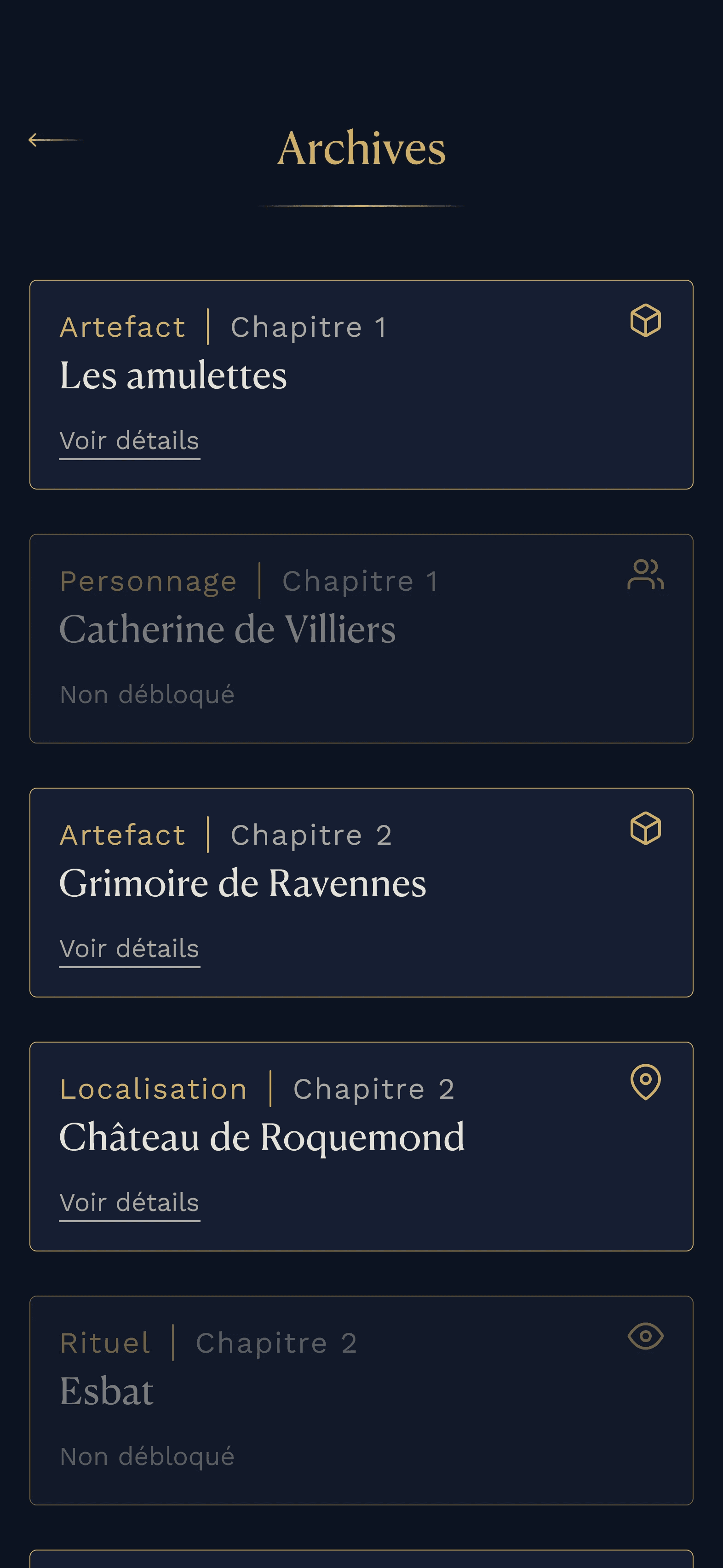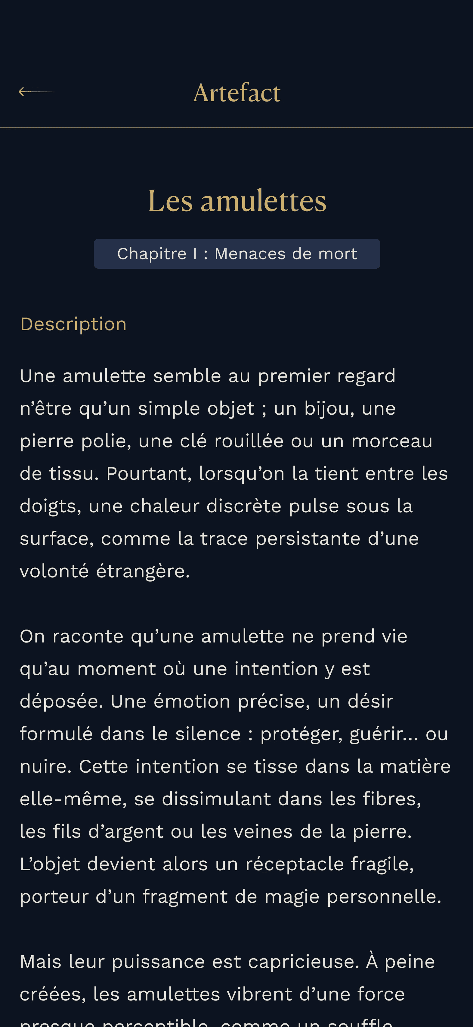 Projet personnel conçu pour créer de l’engouement autour d’un univers fictionnel que je développe parallèlement dans un roman. L’application propose une expérience interactive mêlant narration, choix multiples et immersion dans le lore de cet univers.