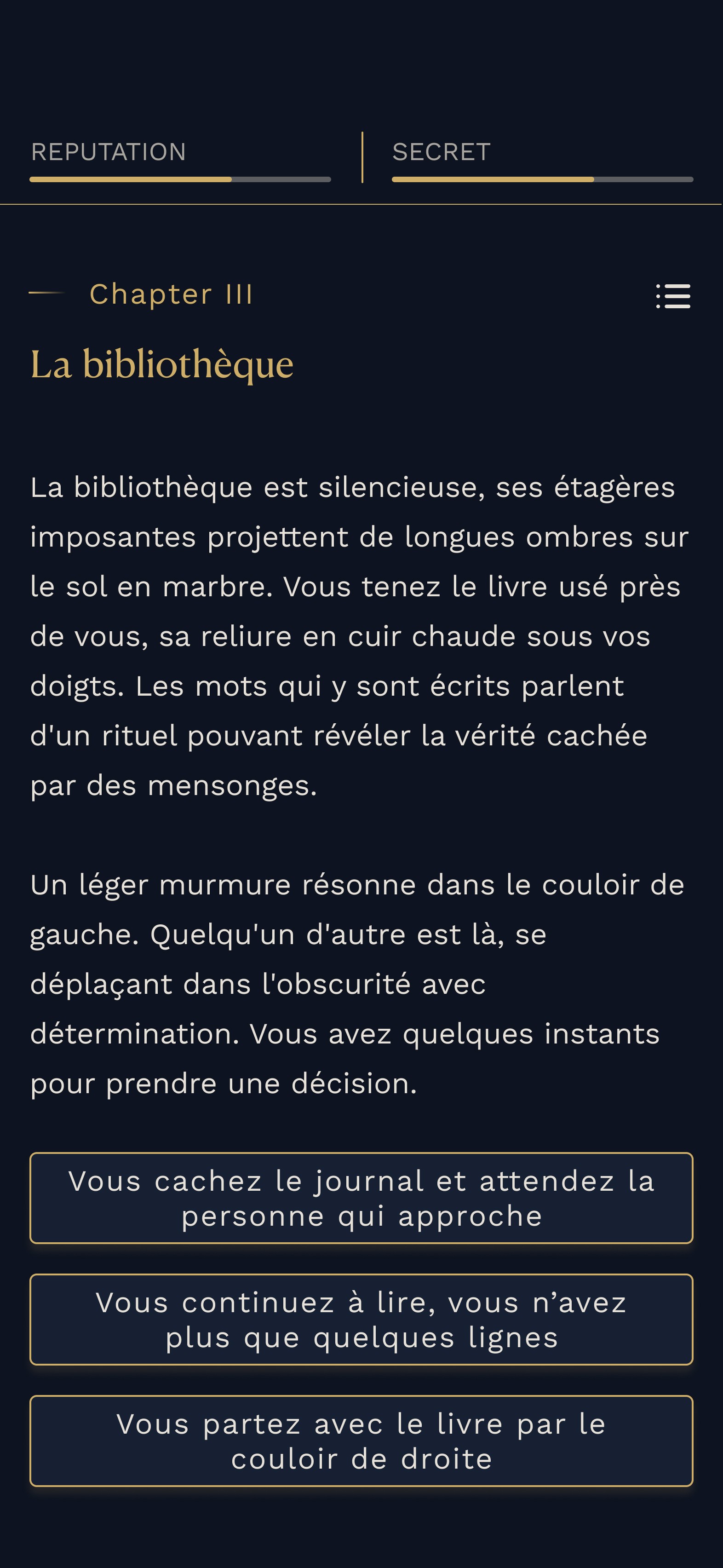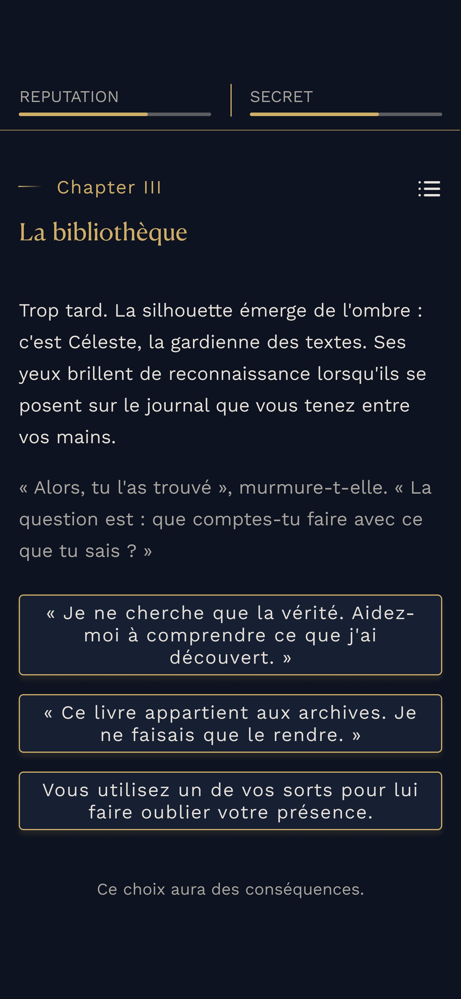 Objectif principal : Vivre une expérience narrative fluide et expressive, où chaque choix a un vrai impact.