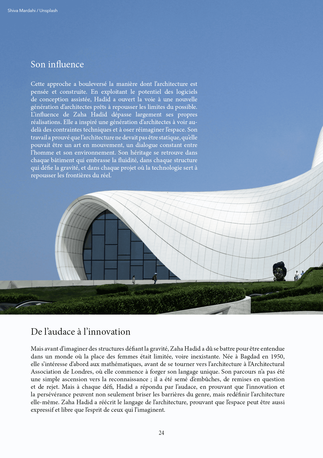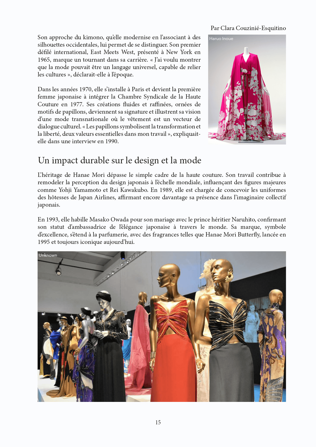 Sélection de cinq doubles-pages : la couverture et la quatrième de couverture (incluant mon texte final), un extrait de l’article sur Gabriella Crespi, mes deux doubles-pages consacrées à Hanae Mori, ainsi que la fin de l’article dédié à Zaha Hadid.