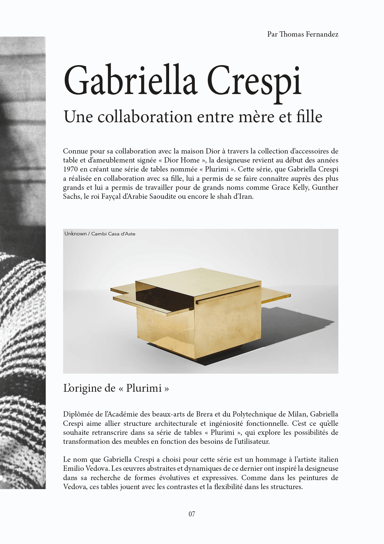 Projet réalisé dans le cadre d’un cours d’écriture, en groupe de huit. L’objectif était de concevoir un magazine autour d’un thème lié au design. Notre groupe a choisi de mettre en lumière des femmes designers du XXᵉ siècle, en veillant à représenter différentes nationalités et disciplines. Chaque membre du groupe a rédigé un article, puis j’ai pris en charge la mise en page et la cohérence éditoriale de la publication.